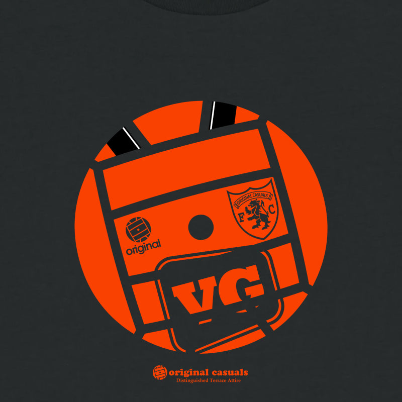 This bold circular graphic reimagines a classic Dundee United shirt through a stripped-back, ultra-minimal layout that speaks straight to the terraces. The unmistakable tangerine dominates the design, cut through with sharp white panel lines and finished with a reworked crest that nods to the club’s proud identity. A modern tribute to matchday culture, built for those who carry the spirit of Tannadice wherever they go.