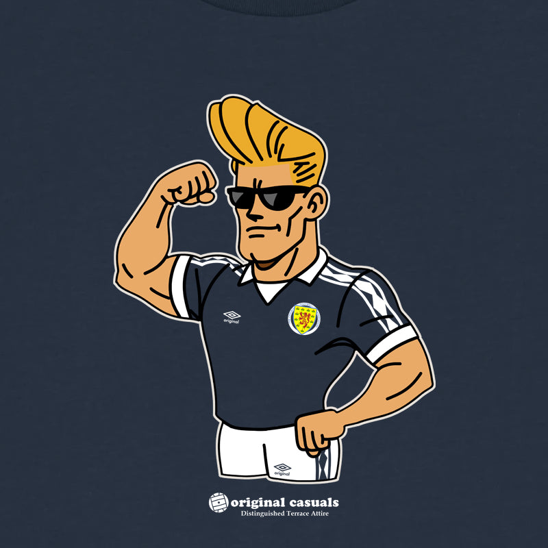 A tongue in cheek tribute to modern Scottish grit, this design flips terrace folklore into bold cartoon swagger, capturing that unmistakable blend of strength confidence and national pride. With a pumped up pose and unmistakable Scotland colours, it celebrates big moments big personalities and the humour that runs through the stands on matchday. Built for those who know the culture and wear it with a wink, this one is all about backing your own and doing it with attitude.