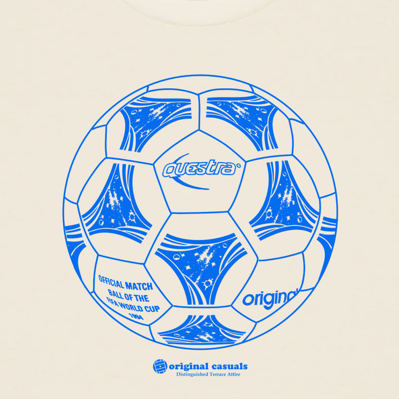 A celebration of pure 90s football nostalgia, this design pays homage to the legendary Questra match ball of USA ’94, instantly recognisable with its cosmic-themed panels and futuristic energy. It captures the spirit of a tournament defined by bold colours, summer heat, giant stadiums and unforgettable moments, all reimagined through the terrace-minded lens of Original Casuals. Perfect for anyone who still feels the magic of that era every time they see the iconic swirl of the Questra.