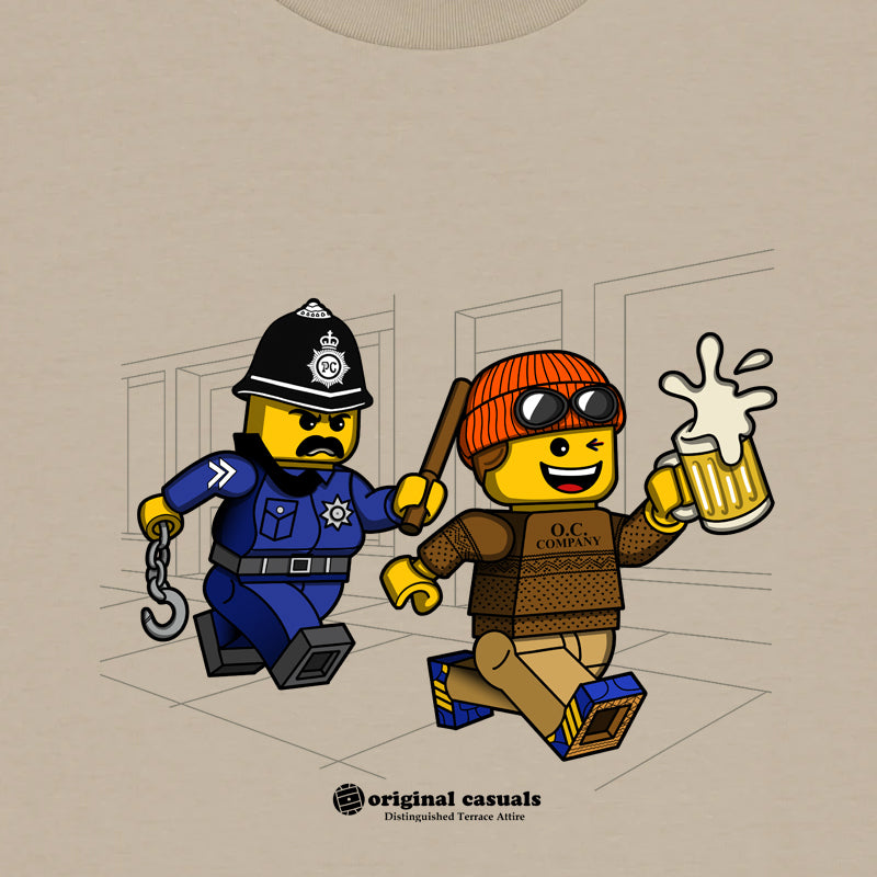 Lego Saturday Joys captures the fun side of terrace life with a playful nod to classic street scenes. Featuring bold cartoon figures mid-chase, pint in hand and attitude intact, it brings humour and nostalgia together in true Original Casuals fashion. A light-hearted tribute to matchday mischief and everyday legends.