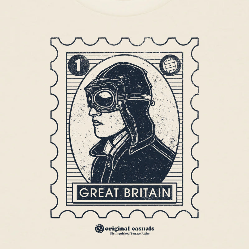 The Stamp celebrates British terrace heritage with a clever graphic twist on a national icon. Featuring a detailed design of a goggle-clad figure framed like a classic postage stamp, it blends pride, nostalgia, and identity. A nod to homegrown culture, made for those who wear their roots with style.