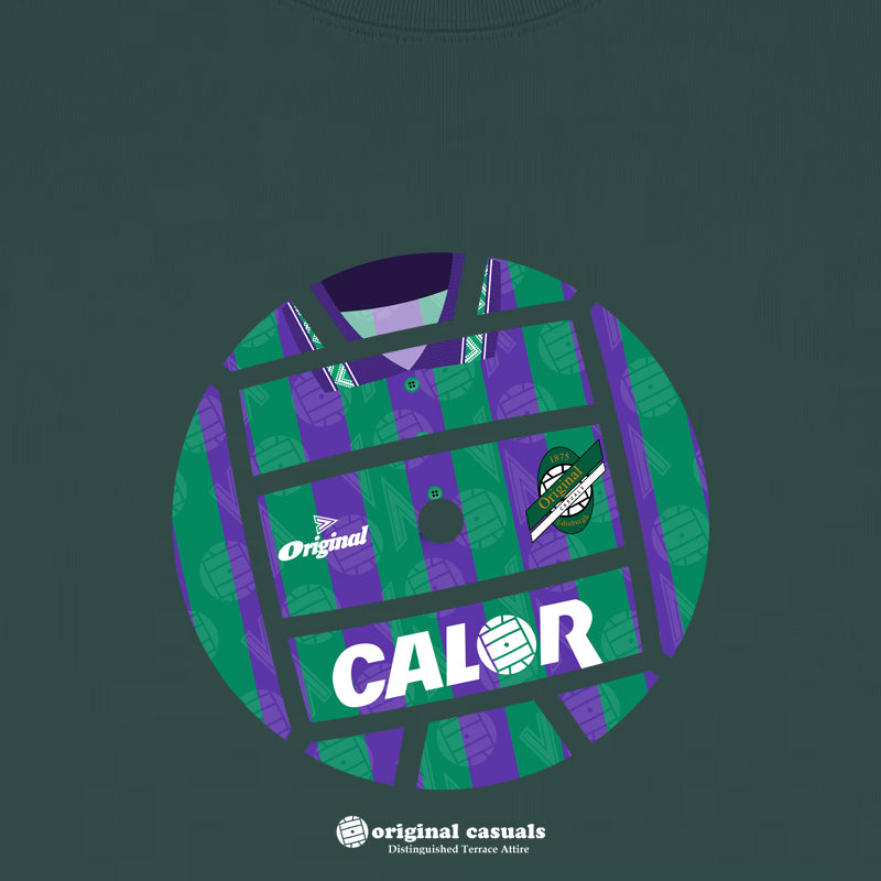 Our Get Stripped - Hibs Away design features the 1994-95 away strip with our OC twist seeing the football graphic replaced by the iconic OC ball with the overlaying stripe sees 'Hibernian' replaced with 'Original Casuals' text.