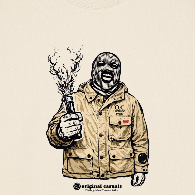 This design draws from the darker side of terrace culture where anonymity is part of the uniform and intention is never accidental. Featuring a figure masked in everyday casual attire, it reflects how familiar styles are used to blend in, move unnoticed and cause disruption when the moment calls for it.